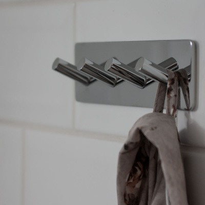 Base is a series of bathroom accessories that are completely made of stainless steel and has a self-adhesive tape on the back which makes the assembly simple and it is mounted without drilling. Base 200 4-hook is available in four different designs; Chrome, brushed stainless steel, matte black and brass.