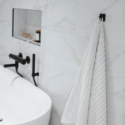 NOTE! Attached to durable smooth surfaces such as tiles, lacquered or veneered board materials, etc. It is not appropriate to attach the products to uneven / rough surfaces where the tape does not get full contact or surfaces that can screw up such as wet room wallpaper. On newly tiled walls, it is important that the surface is thoroughly cleaned so that no joint adhesive remains on the mounting surface.