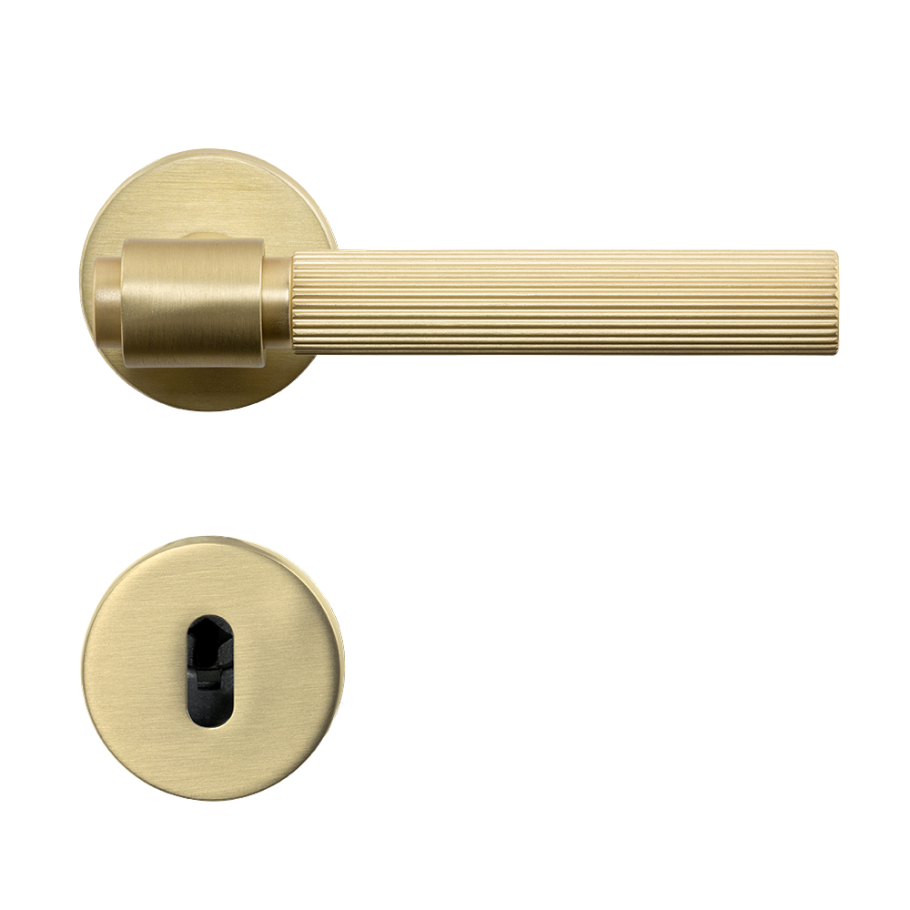 Door handle Helix Stripe in brass has a ribbed surface with stripes that stand out with an industrial design. The door handle has a resilient spring, which means that the handle always returns to its basic position. Perfect for all doors indoors. Feel free to match the door handle with a door stop or kitchen handle in the same series to get a whole in the interior of the home.