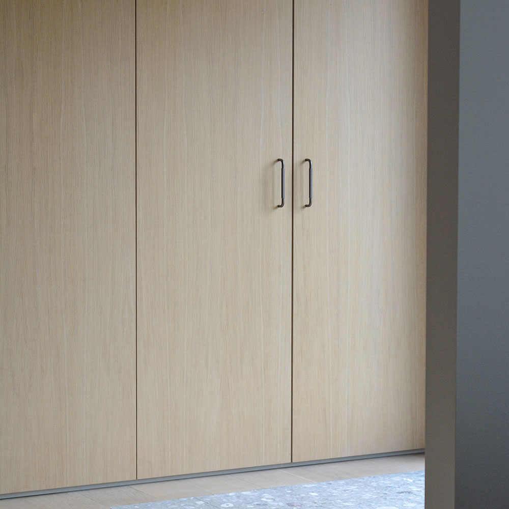 The Helix handle in dark bronze has a wonderfully textured surface and is made of aluminum, providing good durability to the handle. Bronze tones are a favorite in the world of interior design and pair nicely with various furniture, decor, and kitchen styles. The dark bronze hue has a shifting luster with both brown tones and smoky gray accents. The handle's finish complements natural colors and materials very well, as it is highlighted in a very nice way, creating harmony and balance while being elegant.
