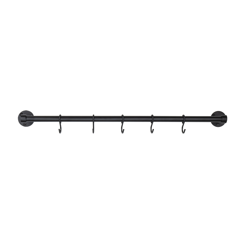 The package includes the bar with associated brackets, five hooks, and six screws for mounting. The bar is 600mm long, and together with the associated brackets, the total length of the railing is 640mm, 50mm wide, and the distance from the wall is 70mm. The rod can be cut using a hacksaw or similar tool. The bar can also be extended by adding an extra bar with associated brackets and hooks for more hanging options, which can be purchased separately.